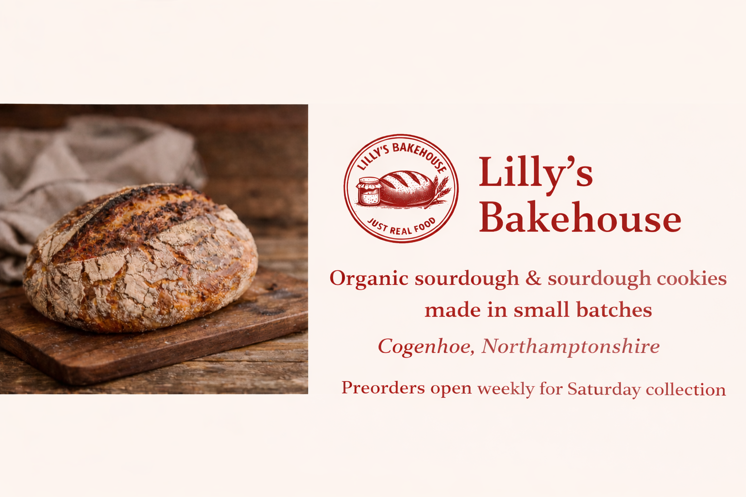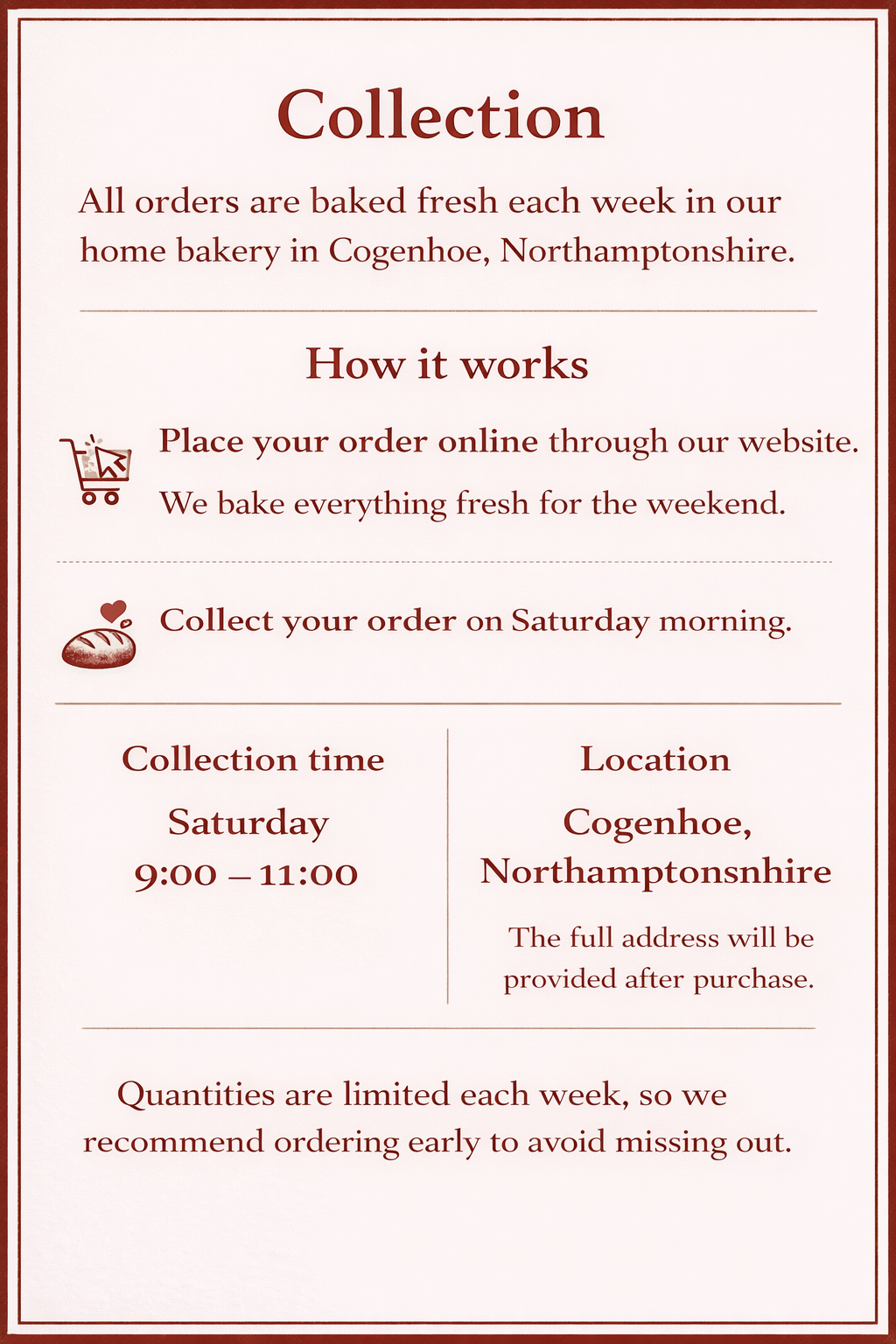 Orders for bread and cookies to be collected must be placed by Wednesday at 4:00 PM for that week’s bake.